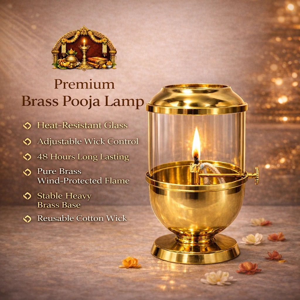 Unlike ordinary diyas that flicker and go out with the slightest breeze, our Akhand Deep features a precision-fitted clear glass chimney that shields the flame from wind, fans, and air movement โ making it perfect for homes with open windows, ceiling fans, or small children. The sacred light stays protected, burning as a symbol of your unwavering devotion.