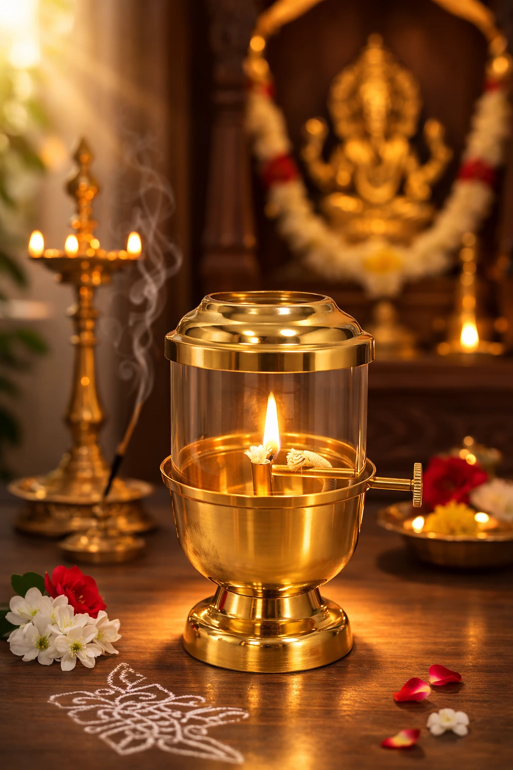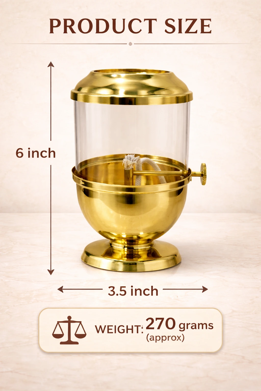 Q: Can this be used as home decor when not lit? A: Absolutely. The polished brass and glass design makes it a beautiful decorative piece for any mandir shelf, living room, or pooja room even when unlit.
